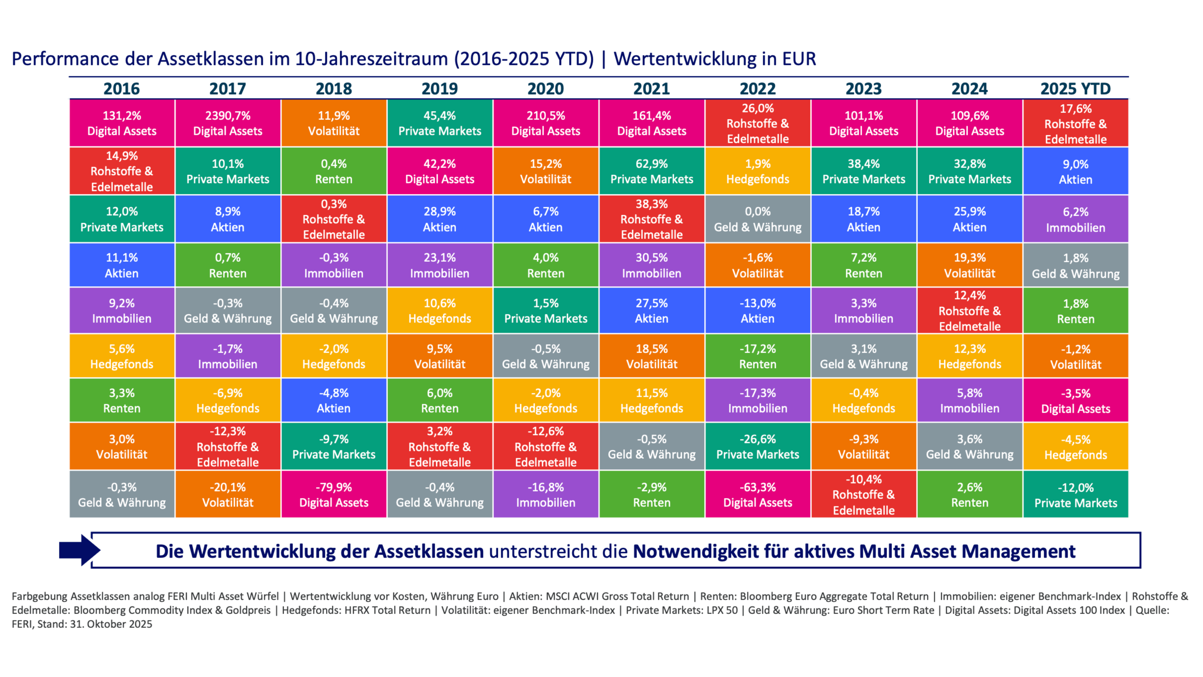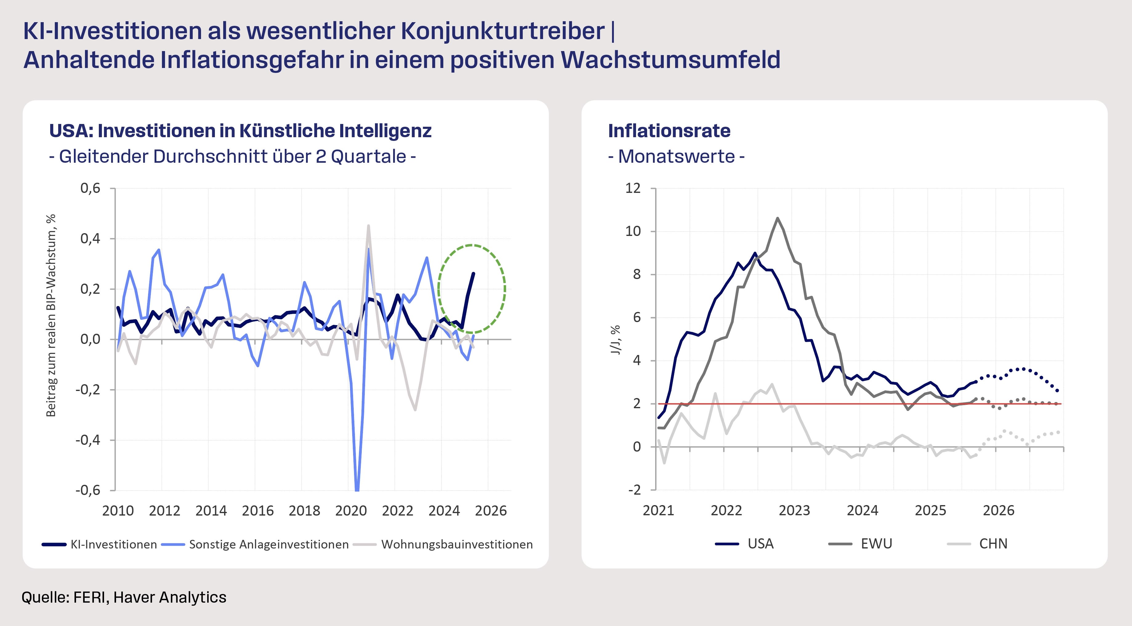Diese Mitteilung dient allein Ihrer unverbindlichen Information und stellt kein Angebot zu Kauf, Verkauf oder Zeichnung eines Anlagetitels oder zur Verwaltung von Vermögenswerten dar. Alle hierin enthaltenen Aussagen und Informationen basieren auf Quellen, die für zuverlässig erachtet wurden. Dennoch wird keine Gewähr für deren Richtigkeit und Vollständigkeit übernommen. Entsprechendes gilt für Meinungen, Empfehlungen, Analysen, Konzepte und Prognosen, die lediglich unverbindliche, subjektive Werturteile unseres Hauses darstellen. Aussagen zu Wertentwicklungen, Simulationen oder Prognosen von Finanzinstrumenten, Indizes oder Wertpapierdienstleistungen sind kein verlässlicher Indikator für künftige Entwicklungen. Dieses Dokument ersetzt keine Anlage-, Rechts- oder Steuerberatung und berücksichtigt nicht persönliche, insbesondere finanzielle, Verhältnisse, Anlagestrategien und -ziele sowie Erfahrungen und Kenntnisse. Dieses Dokument genügt nicht allen gesetzlichen Anforderungen zur Gewährleistung der Unvoreingenommenheit von Anlageempfehlungen und Anlagestrategieempfehlungen. Für jedes Investment und dessen Verwaltung sind ausschließlich die jeweiligen Zeichnungsdokumente, Verkaufsprospekte und/oder Vertragsunterlagen, ergänzt durch den jeweils letzten geprüften Jahres- und Halbjahresbericht sowie die wesentlichen Anlegerinformationen, maßgeblich. Diese enthalten auch Angaben zum Risikoprofil und zu den Risikohinweisen. Interessenten können diese Unterlagen in elektronischer oder gedruckter Form kostenlos in deutscher Sprache bei der jeweiligen Kapitalverwaltungsgesellschaft oder Verwahrstelle erhalten. Die vorliegende Information bezieht sich ausschließlich auf den Zeitpunkt der Erstellung. Sie wird nicht fortlaufend aktualisiert. Wir behalten uns vor, Meinungen und Empfehlungen auch ohne erneute Mitteilung zu ändern. Die hierin enthaltenen Angaben und Informationen dürfen nicht in den USA oder anderen Rechtsordnungen, in denen sie Beschränkungen unterworfen sind, verbreitet oder verwendet werden und richten sich nicht an US-Personen (gemäß Regulation S des US Securities Act von 1933 und/oder Rule 4.7 der US Commodity Futures Trading Commission). Soweit Sie weiter gehende Informationen oder eine anleger- und objektgerechte Beratung wünschen, empfehlen wir Ihnen, sich mit Ihrem Kundenberater in Verbindung zu setzen. Die Weitergabe dieser Information an Dritte sowie Kopieren, Nachdrucken oder sonstiges Reproduzieren ganz oder teilweise sind nur nach unserer schriftlichen Zustimmung zulässig. FERI übernimmt keine Haftung für etwaige Schäden oder Verluste, die direkt oder indirekt aus der Verteilung oder Verwendung dieser Information entstehen. FERI ist in Deutschland als Mittleres Wertpapierinstitut zugelassen. In Österreich ist FERI durch eine Zweigniederlassung vertreten, Getreidemarkt 14/25, A-1010 Wien. FERI unterliegt der Aufsicht durch die Bundesanstalt für Finanzdienstleistungsaufsicht (BaFin), Graurheindorfer Str. 108, 53117 Bonn. Die BaFin hat jedoch diese Information weder überprüft noch genehmigt oder gebilligt. Stand: November 2025.