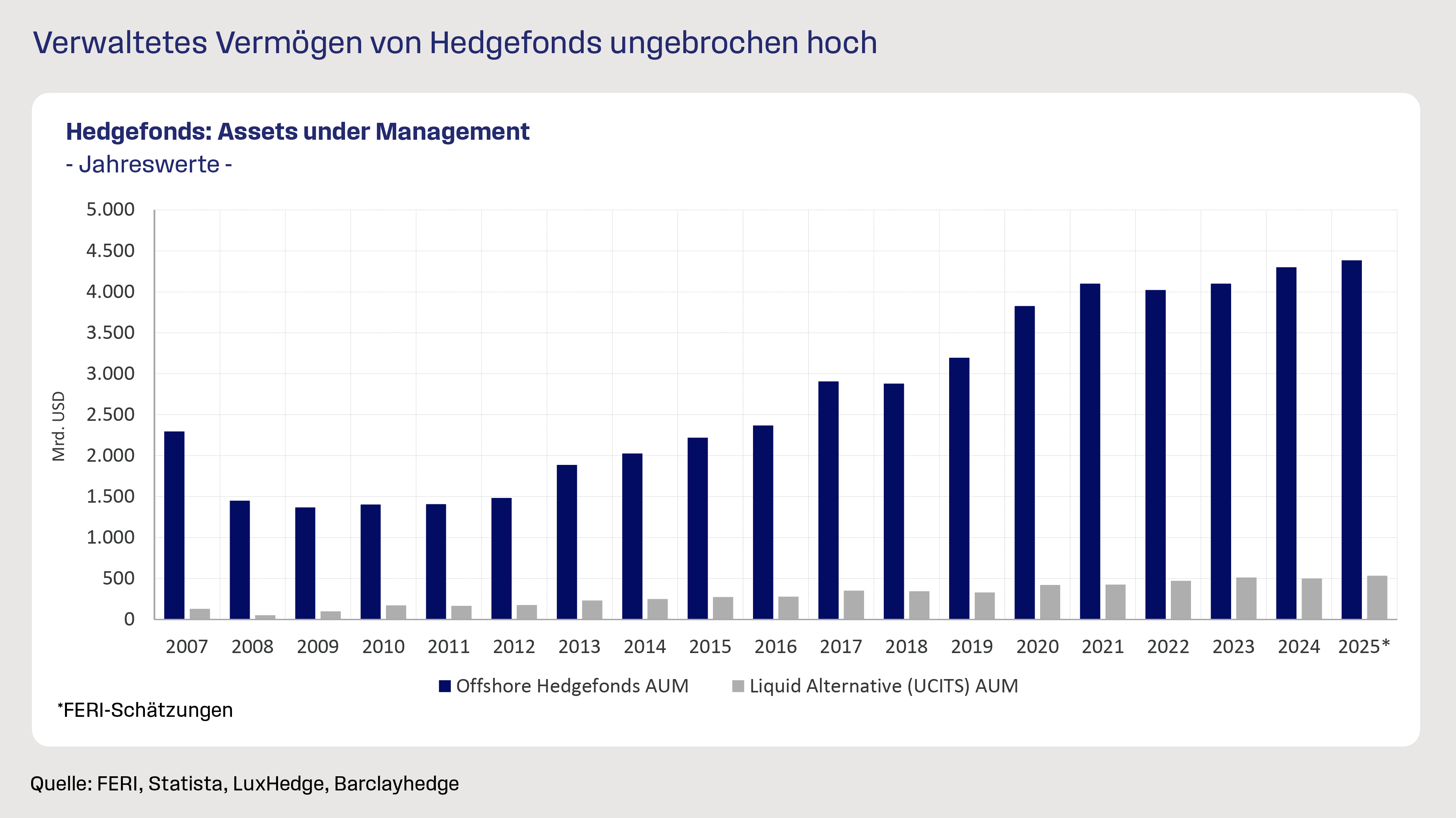 Hedgefonds verzeichneten im Jahr 2025 insgesamt eine überdurchschnittliche Performance mit positiven Ergebnissen über alle Hauptstrategien hinweg. Gleichzeitig nahm das Investoreninteresse zu und das verwaltete Vermögen stieg Schätzungen zufolge auf 4,2 Billionen US-Dollar.