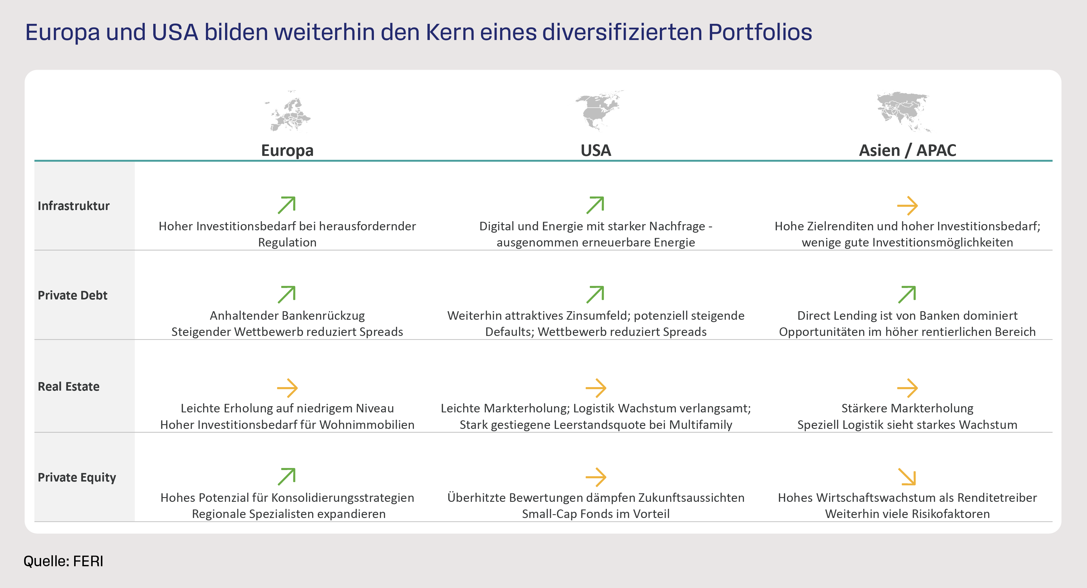 Diese Mitteilung dient allein Ihrer unverbindlichen Information und stellt kein Angebot zu Kauf, Verkauf oder Zeichnung eines Anlagetitels oder zur Verwaltung von Vermögenswerten dar. Alle hierin enthaltenen Aussagen und Informationen basieren auf Quellen, die für zuverlässig erachtet wurden. Dennoch wird keine Gewähr für deren Richtigkeit und Vollständigkeit übernommen. Entsprechendes gilt für Meinungen, Empfehlungen, Analysen, Konzepte und Prognosen, die lediglich unverbindliche, subjektive Werturteile unseres Hauses darstellen. Aussagen zu Wertentwicklungen, Simulationen oder Prognosen von Finanzinstrumenten, Indizes oder Wertpapierdienstleistungen sind kein verlässlicher Indikator für künftige Entwicklungen. Dieses Dokument ersetzt keine Anlage-, Rechts- oder Steuerberatung und berücksichtigt nicht persönliche, insbesondere finanzielle, Verhältnisse, Anlagestrategien und -ziele sowie Erfahrungen und Kenntnisse. Dieses Dokument genügt nicht allen gesetzlichen Anforderungen zur Gewährleistung der Unvoreingenommenheit von Anlageempfehlungen und Anlagestrategieempfehlungen. Für jedes Investment und dessen Verwaltung sind ausschließlich die jeweiligen Zeichnungsdokumente, Verkaufsprospekte und/oder Vertragsunterlagen, ergänzt durch den jeweils letzten geprüften Jahres- und Halbjahresbericht sowie die wesentlichen Anlegerinformationen, maßgeblich. Diese enthalten auch Angaben zum Risikoprofil und zu den Risikohinweisen. Interessenten können diese Unterlagen in elektronischer oder gedruckter Form kostenlos in deutscher Sprache bei der jeweiligen Kapitalverwaltungsgesellschaft oder Verwahrstelle erhalten. Die vorliegende Information bezieht sich ausschließlich auf den Zeitpunkt der Erstellung. Sie wird nicht fortlaufend aktualisiert. Wir behalten uns vor, Meinungen und Empfehlungen auch ohne erneute Mitteilung zu ändern. Die hierin enthaltenen Angaben und Informationen dürfen nicht in den USA oder anderen Rechtsordnungen, in denen sie Beschränkungen unterworfen sind, verbreitet oder verwendet werden und richten sich nicht an US-Personen (gemäß Regulation S des US Securities Act von 1933 und/oder Rule 4.7 der US Commodity Futures Trading Commission). Soweit Sie weiter gehende Informationen oder eine anleger- und objektgerechte Beratung wünschen, empfehlen wir Ihnen, sich mit Ihrem Kundenberater in Verbindung zu setzen. Die Weitergabe dieser Information an Dritte sowie Kopieren, Nachdrucken oder sonstiges Reproduzieren ganz oder teilweise sind nur nach unserer schriftlichen Zustimmung zulässig. FERI übernimmt keine Haftung für etwaige Schäden oder Verluste, die direkt oder indirekt aus der Verteilung oder Verwendung dieser Information entstehen. FERI ist in Deutschland als Mittleres Wertpapierinstitut zugelassen. In Österreich ist FERI durch eine Zweigniederlassung vertreten, Getreidemarkt 14/25, A-1010 Wien. FERI unterliegt der Aufsicht durch die Bundesanstalt für Finanzdienstleistungsaufsicht (BaFin), Graurheindorfer Str. 108, 53117 Bonn. Die BaFin hat jedoch diese Information weder überprüft noch genehmigt oder gebilligt. Stand: November 2025.