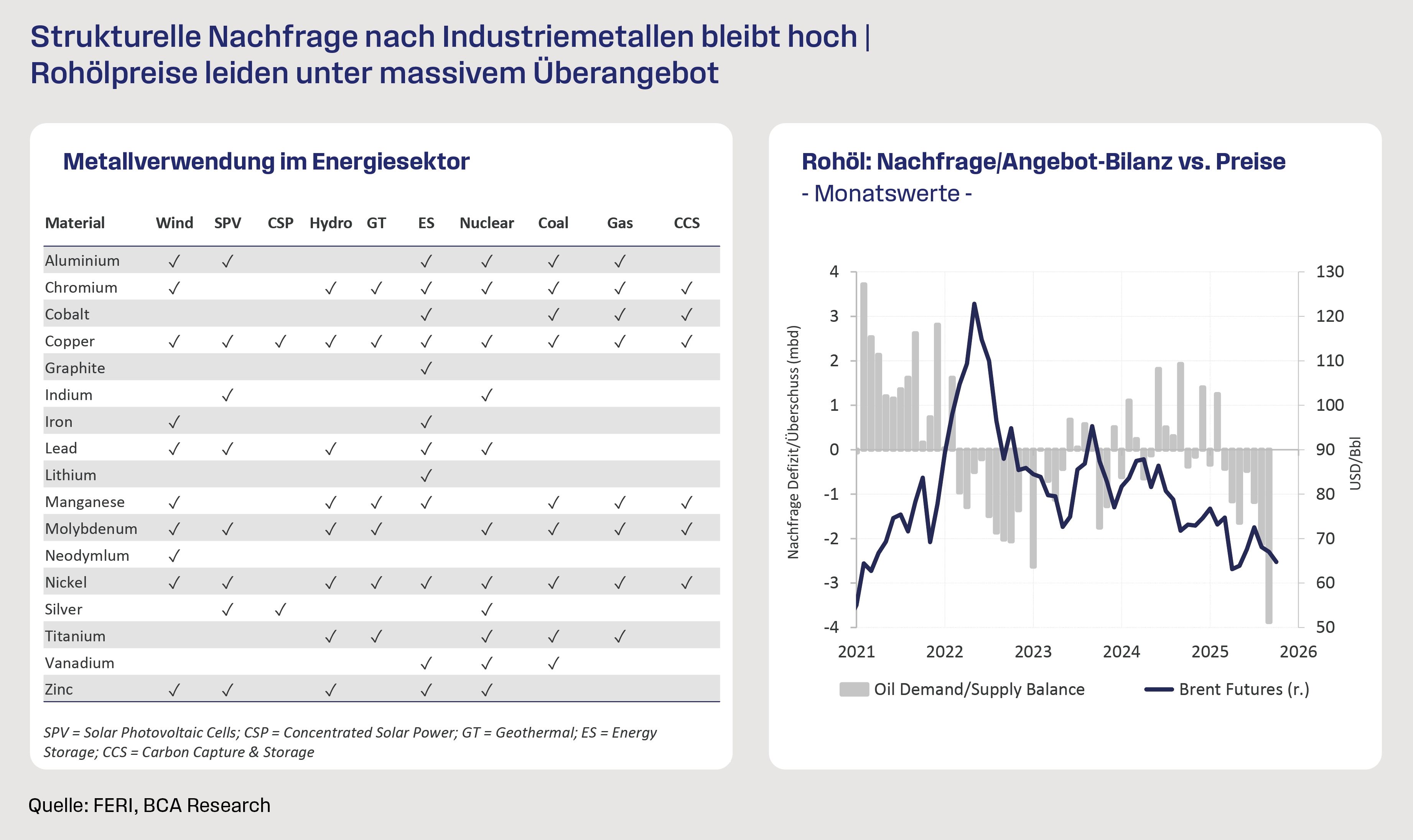 Der Rohölpreis stand auch 2025 unter Druck. Geopolitische Risiken rückten nur phasenweise in den Fokus der Märkte, während die globale Nachfrage in einem spätzyklischen Umfeld und insbesondere infolge der anhaltenden Schwäche Chinas weitgehend impulslos blieb.