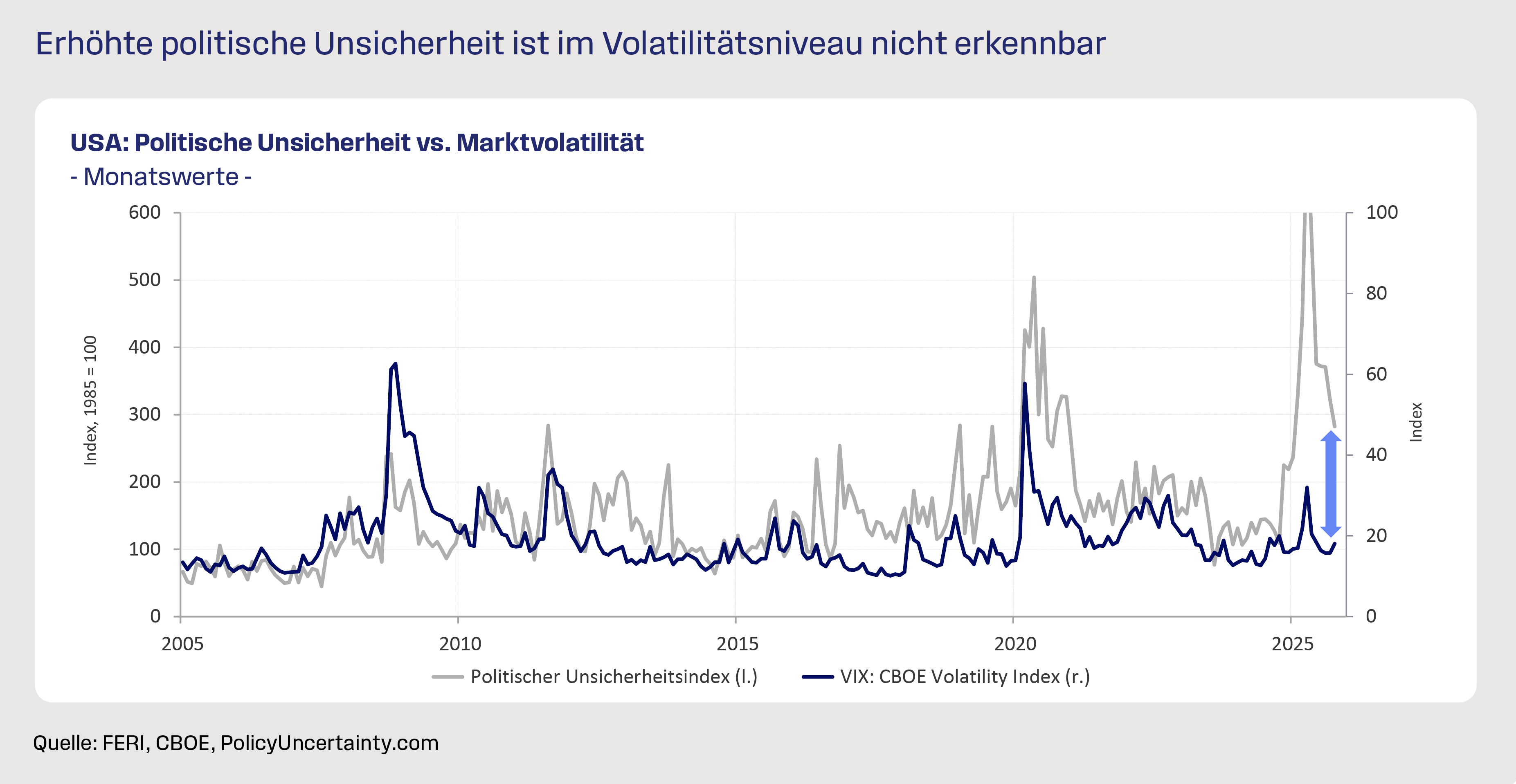 Steigende geopolitische Spannungen, strukturelle Inflationsrisiken, fiskalische Unsicherheiten und eine zunehmende politische Polarisierung lassen jedoch erwarten, dass dieser Zustand nicht von Dauer sein wird: Die sehr hohe Differenz zwischen der politischen Unsicherheit einerseits und der tatsächlichen Volatilität andererseits zeigt eine signifikante Schere zwischen der Wahrnehmung von Unsicherheit in der Realwirtschaft und unter den Marktteilnehmern an.
